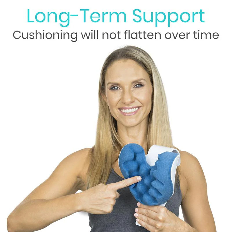 It gently stretches the neck and stimulates pressure points to relieve muscle tension and improve spinal alignment.